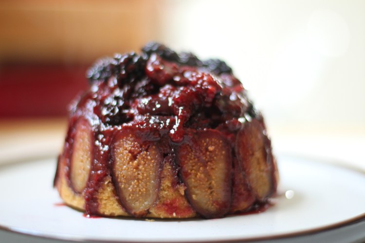 -When cooked turn out onto a plate, warm the rest of the blackberry mix and spoon over the sponge. Serve with custard, ice cream or pouring cream.