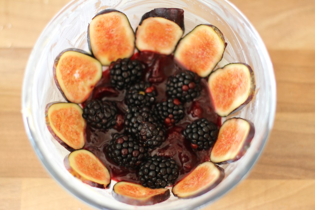 -Butter a 1.2 litre pudding basin, slice the figs 3mm thick and arrange around the sides of the basin. Spoon half of the cooled blackberries into the bottom.