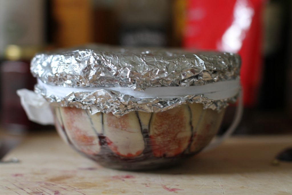 -Cover the basin with a circle of baking powder and a circle of foil on top, making sure they are loose fitting to allow the pudding to rise. Tie around the edge with string to secure.