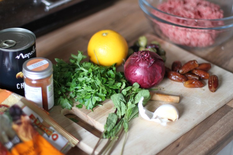 -In a frying pan heat up two tablespoons of olive oil and fry the meat balls until browned on the outside, add the rest of the onions and the tomatoes, chick peas, olives, dates, orange, water and cinnamon stick, season with a little more salt and pepper and gently combine everything together.