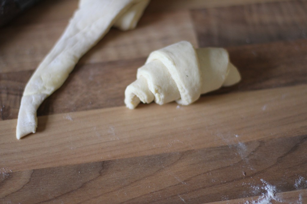 - Roll the triangles of dough from the thick end to the the thin end, bend slightly into a crescent and place on baking parchment.