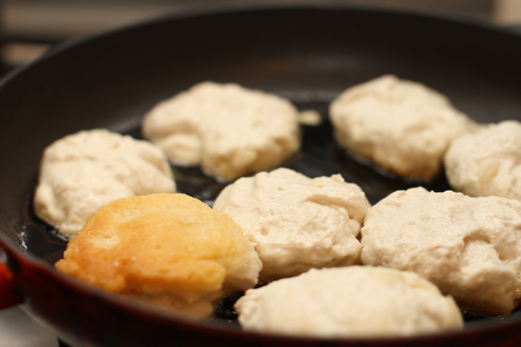 - Drop table spoons of batter mix into the pan and fry until golden brown turn over and turn the heat down low to cook the dumplings through for a couple of minutes.