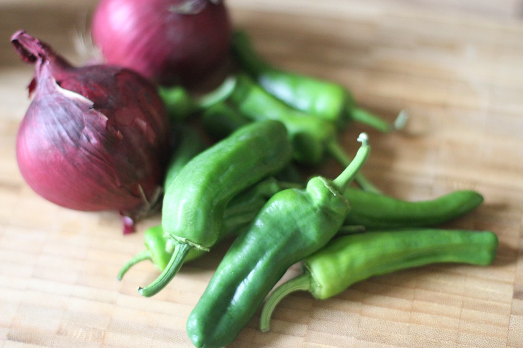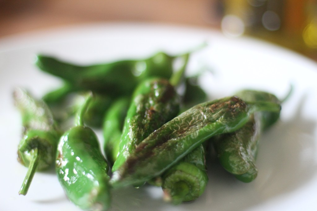 - Heat a saucepan until smoking hot, add a table spoon of oil and brown the outside of the padron peppers in batches, set them to one side.
