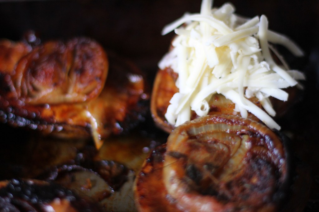 - Turn the potatoes flat side up using a spatula and place one of the cooked onion rings from underneath the pork on top. Sprinkle with cheese to top all the potatoes and place back into the oven for 10 minutes while the pork rests.