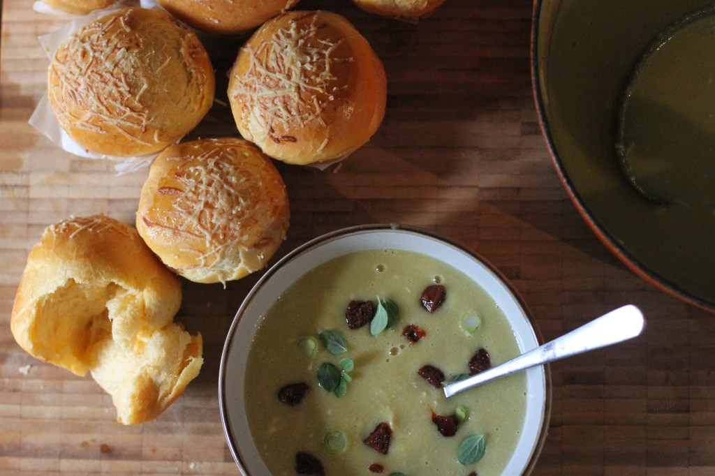 - In another sauce pan add the butter, onions, celery, garlic and potatoes. Cook on a gentle heat with the lid on, stirring regularly, try not to let the veg brown. Cook until the potatoes are beginning to soften.