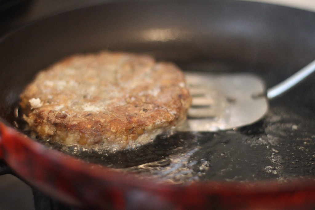 - Over a moderate heat, fry the burgers until golden brown and crispy all over.
