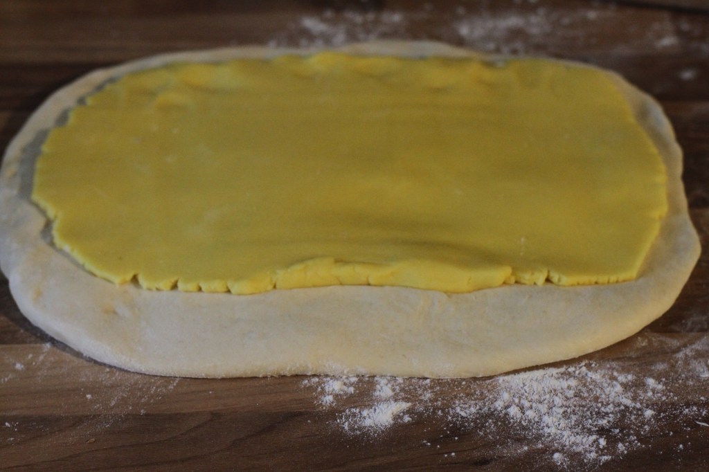 - Place the marzipan on top of the dough leaving a 2 inch gap of dough on one of the long sides.