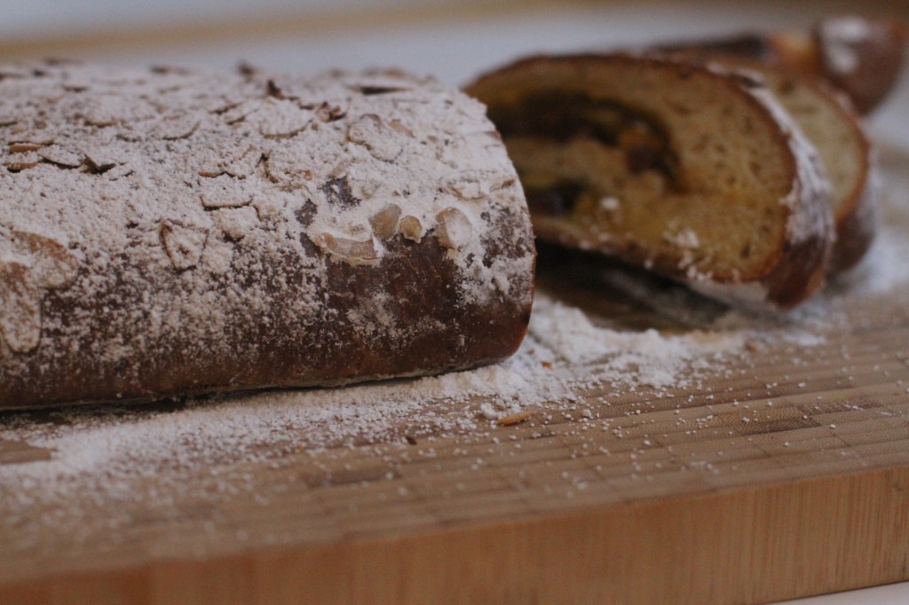 - Roll the stollen up, leaving the side with the exposed dough until the end. Gently fold the short ends underneath to round of the ends.