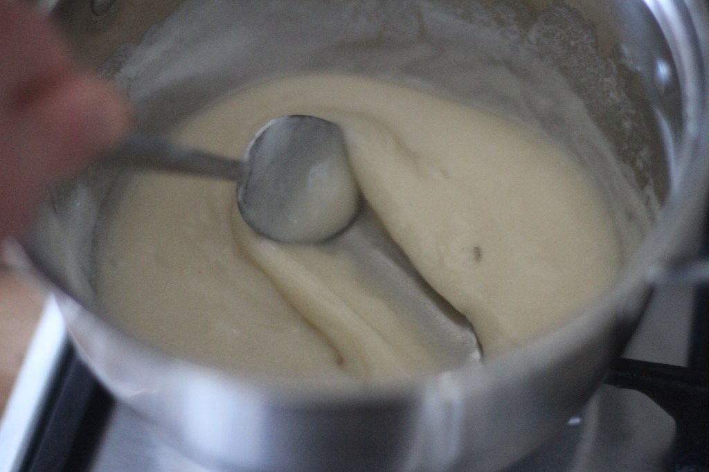 - Start by putting 50g of the flour and the water in a saucepan. Mix together then cook on a low heat, stirring constantly until the mixture becomes a thick paste, continue to cook for 2-3 minutes continuing to stir then remove from the heat. Place the paste in a bowl and cover with clingfilm with the clingfilm touching the paste to stop a skin forming. Allow to cool at room temperature.