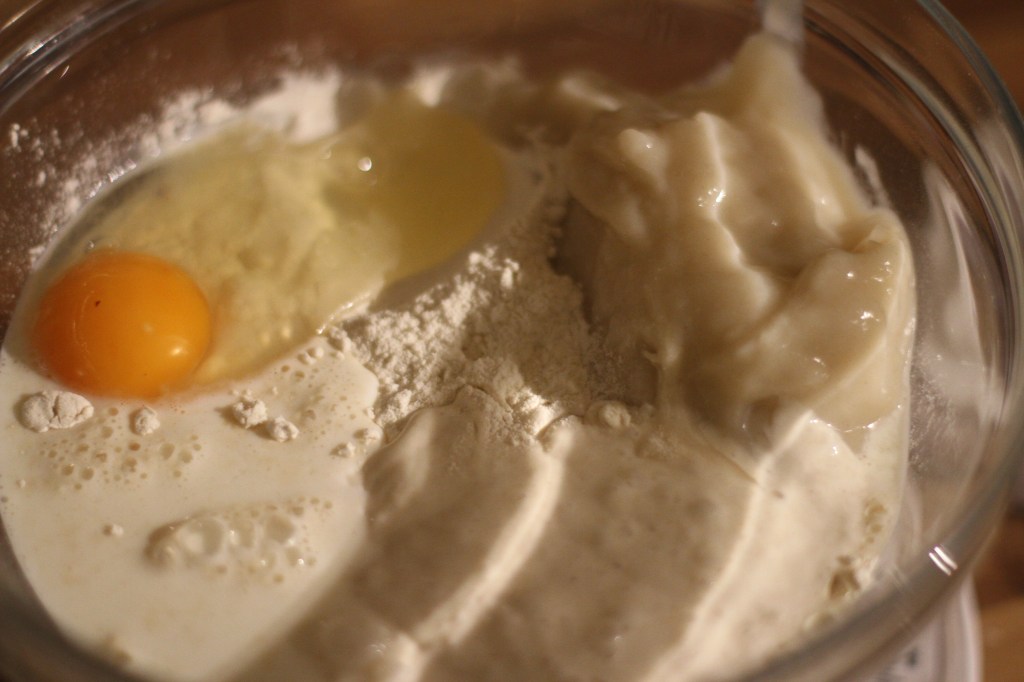 - In separate bowl add the rest of the flour, sugar, milk powder, whole egg, salt, milk and sourdough starter as well as the cooled flour and water paste.