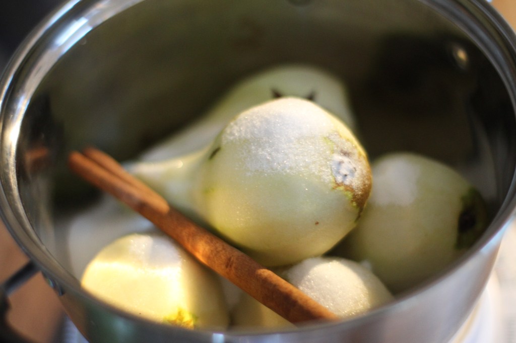 - Place the peeled pears, cinnamon stick, star anise and caster sugar in a pan and fill with water to cover the pears.