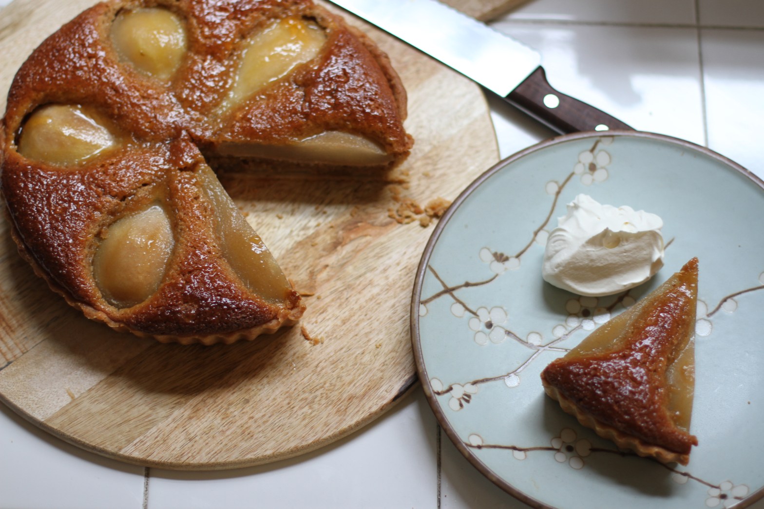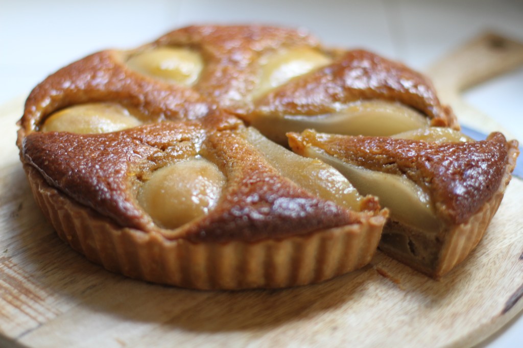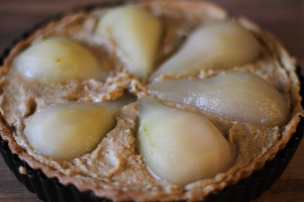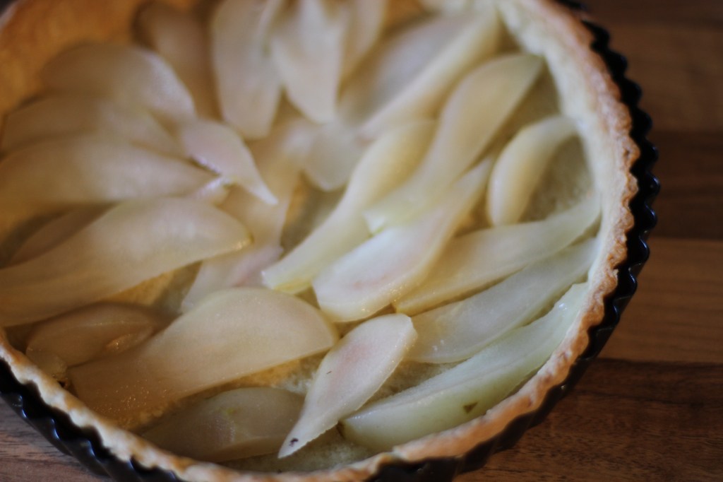 - Line the bottom of the cooked pastry case with the thinly sliced pear.