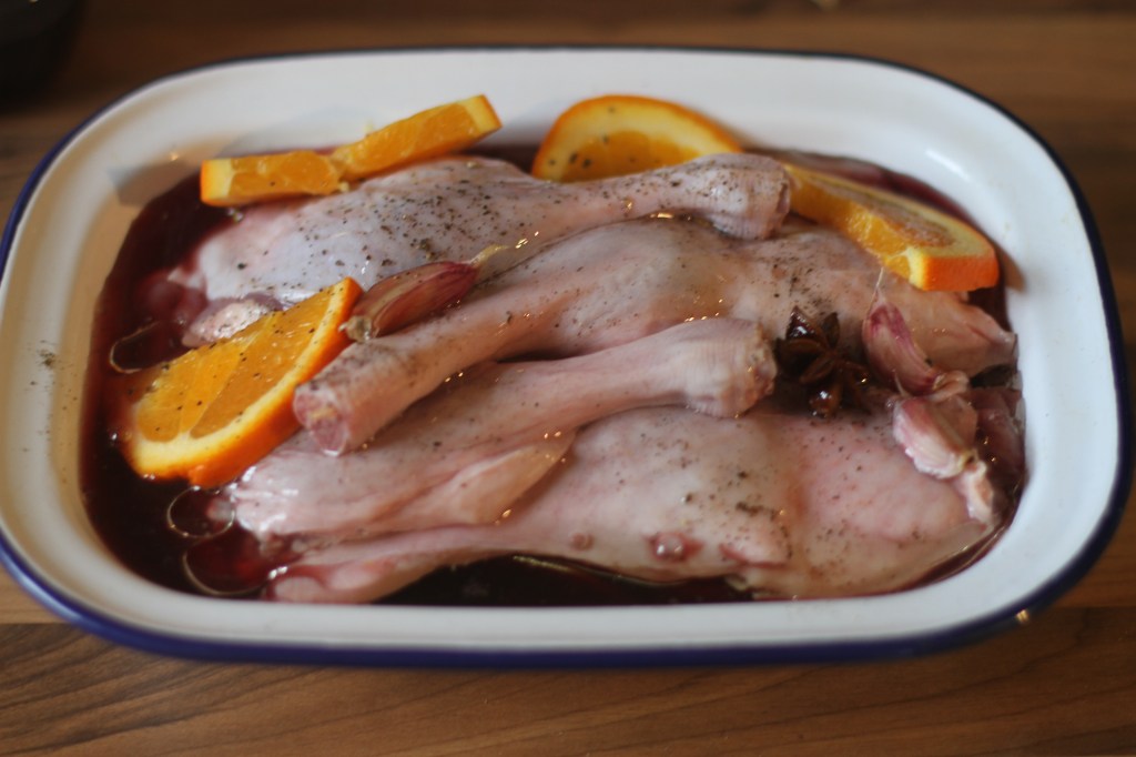 - When the duck legs are tender remove the dish from the oven and carefully lift them out of the cooking liquid.