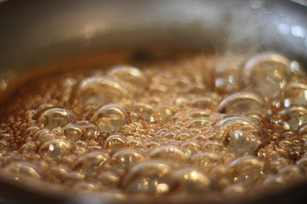 - Continue to boil and reduce the sugar and water by about half and has thickened (this will probably take 5 minutes)