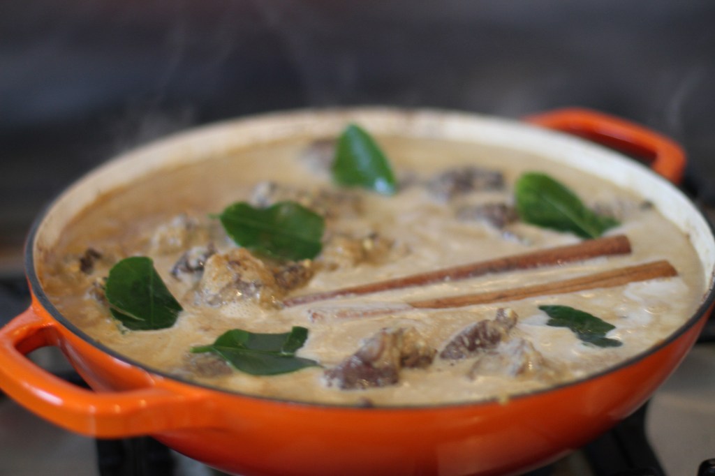 - Add the coconut milk, cinnamon sticks, lime leaves and salt and pepper and stir to bring everything together.