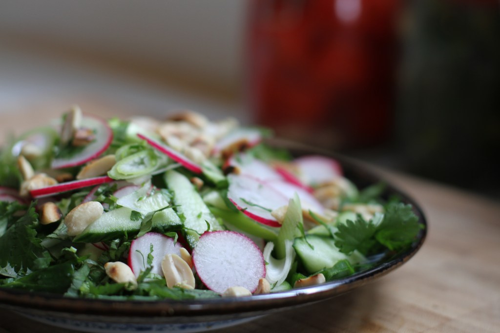 Half a cucumber, cut lengthways into 4, seeds removed and sliced thin at an angle.