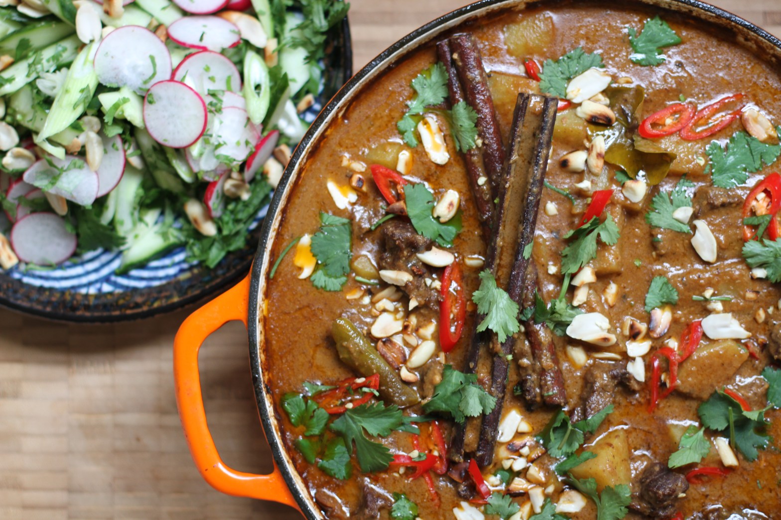 - Finish by topping with toasted peanuts, coriander and freshly sliced chillis.