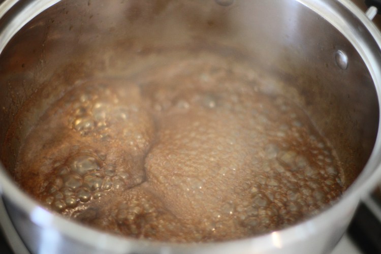 - Place the butter, sugar, treacle, golden syrup and water in a pan and bring to the boil, stirring constantly. Allow to boil vigorously for one minute before adding the cream. Simmer for two more minutes before removing from the heat.