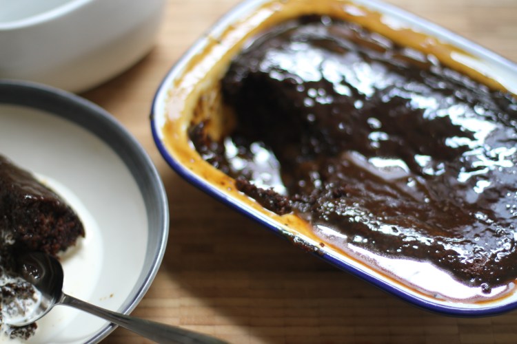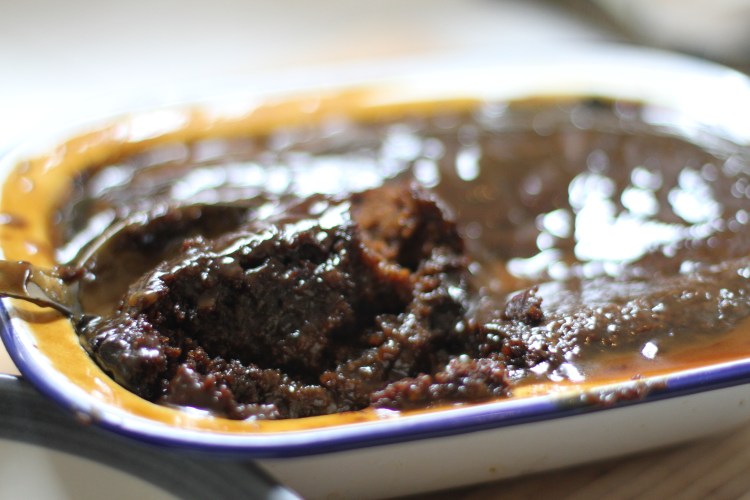 - Spoon the sponge mix into the dish on top of the toffee sauce so that it fills two thirds of the way up the sides.