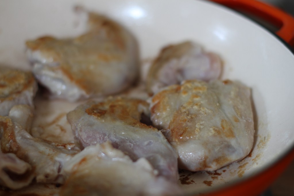- Dip the rabbit pieces in the flour to coat and fry in the oil a few pieces at a time to brown, set aside when all are done.