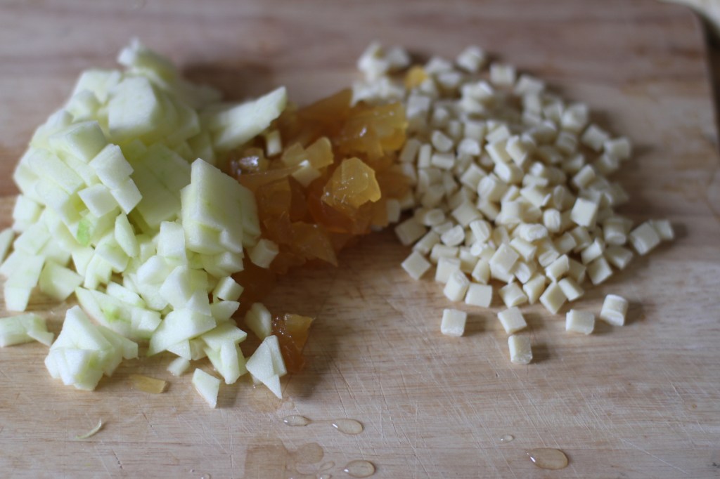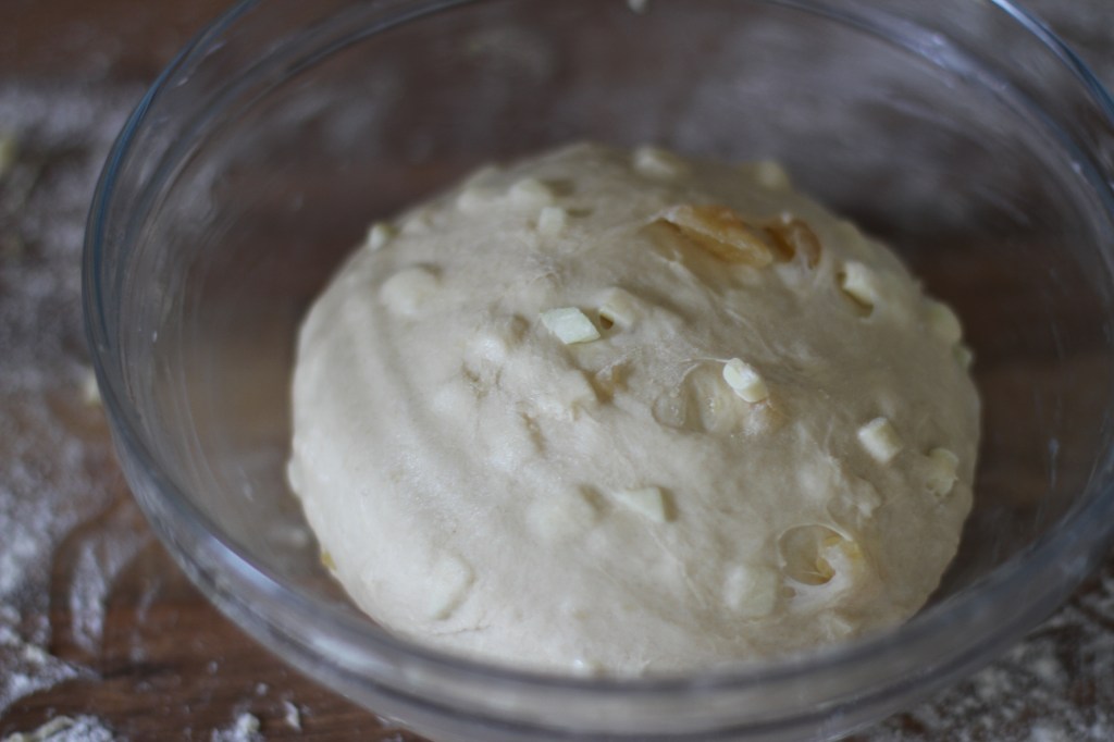 - Flatten the dough out slightly and place the apple, ginger and chocolate pieces into the centre. Fold the edges of the dough around the pieces and slowly kneed until everything is incorporated.