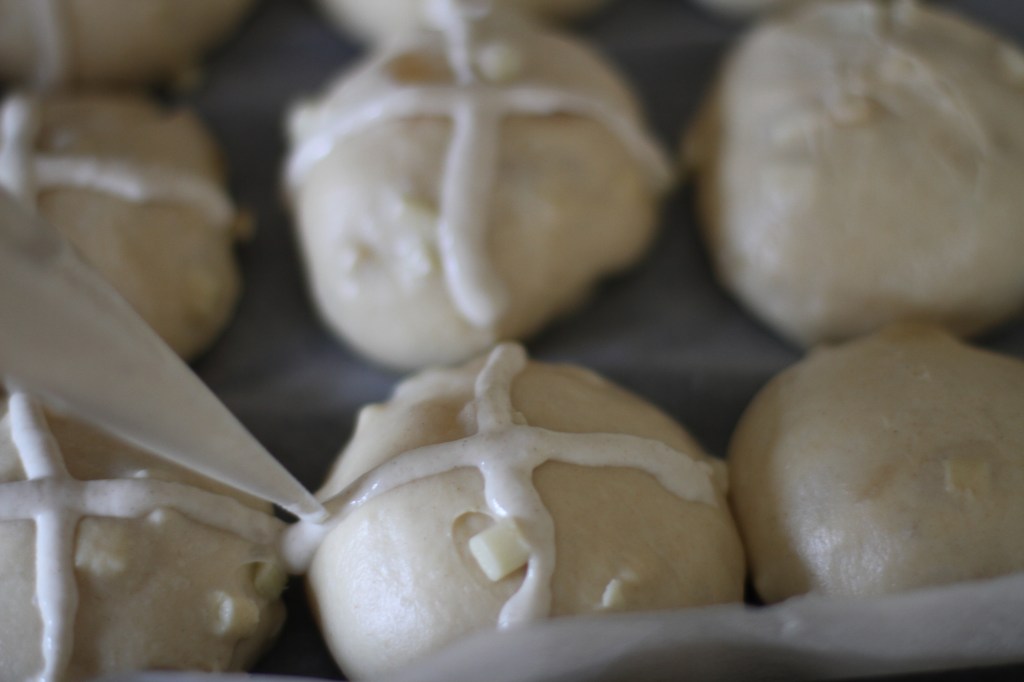 - Using a piping bag with a small nozzle or a disposable piping bag with a 2mm opening cut out of the point, fill with the flour paste and pipe crosses over the top of the buns.