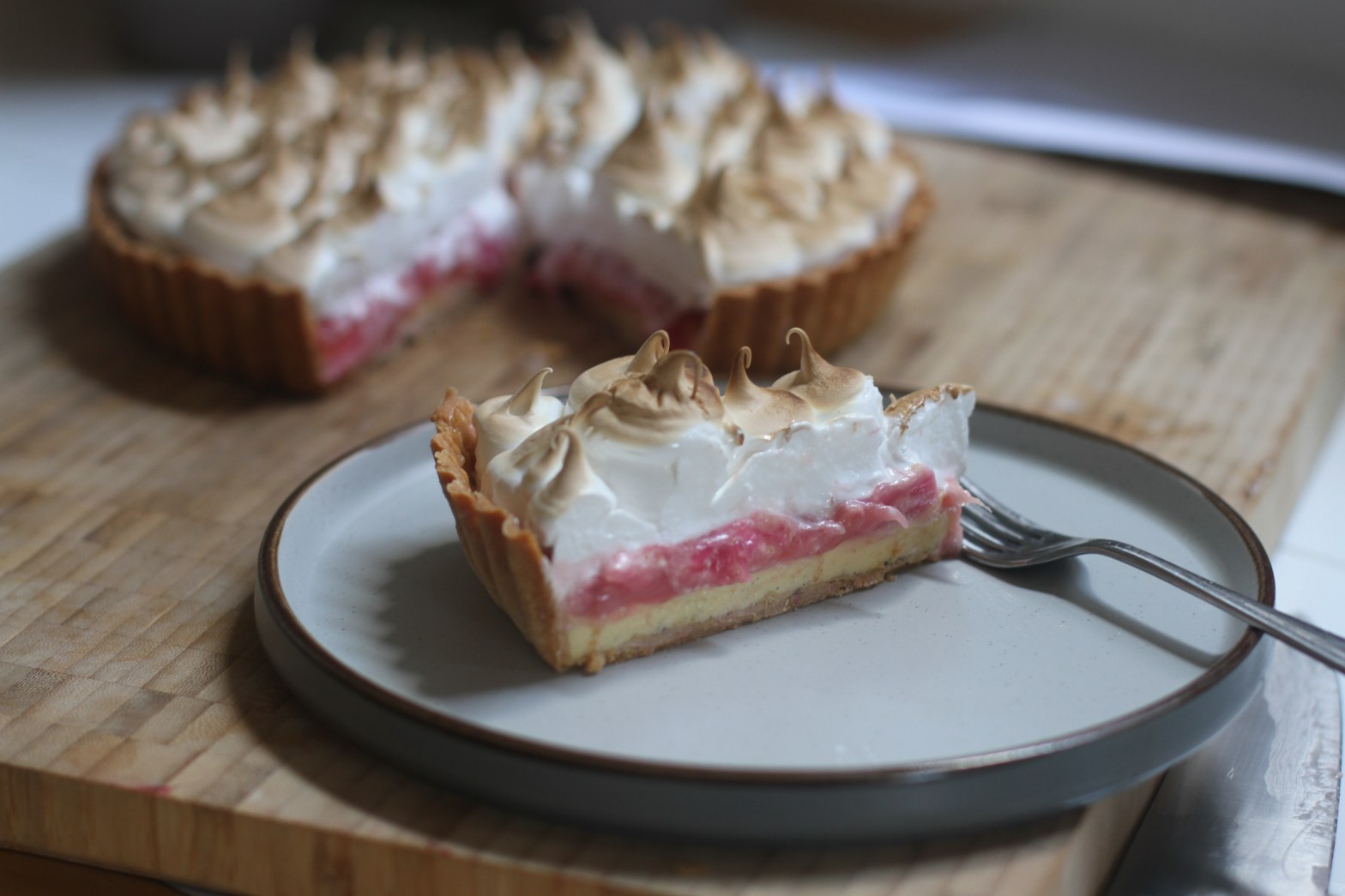 A classic combination of rhubarb and custard topped with Swiss meringue.